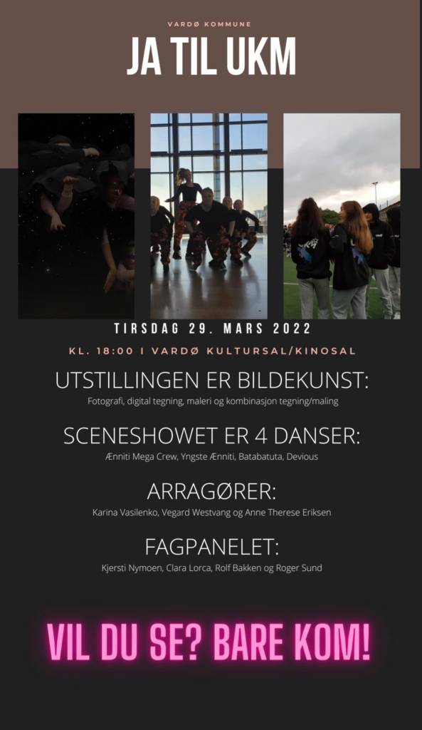 – Da er det klart for et kort UKM i Vardø, det er kommet inn 4stk utstilling i form av bilder som henges opp. Ænniti «varmer opp» sceneshowet med 2 danser. Etter det, danser de 2 gruppene som deltar i UKM.